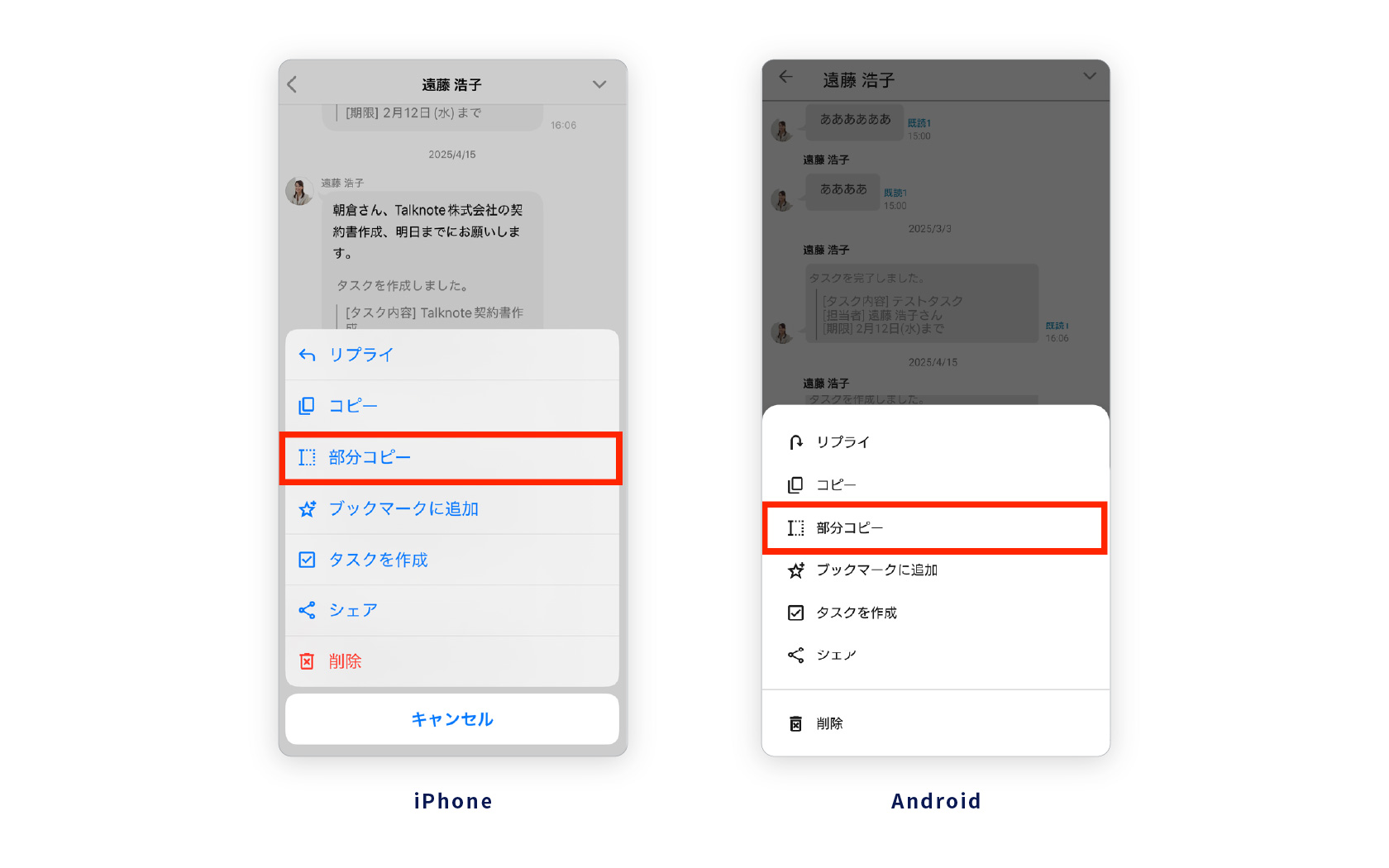 テキストを部分的にコピーしたい投稿/コメント/メッセージを長タップすることで「部分コピー」が選択できるようになりました。