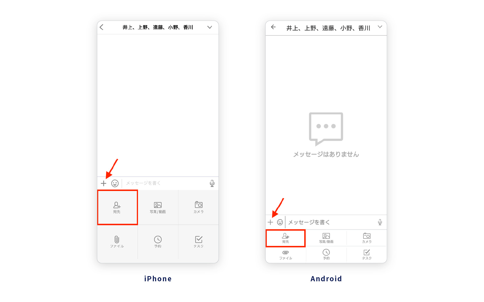 メッセージスレッドにて、送信フォームにある「+」をタップし、人型マークの「宛先」を選択することで、宛先の追加(メンション)ができるようになりました。