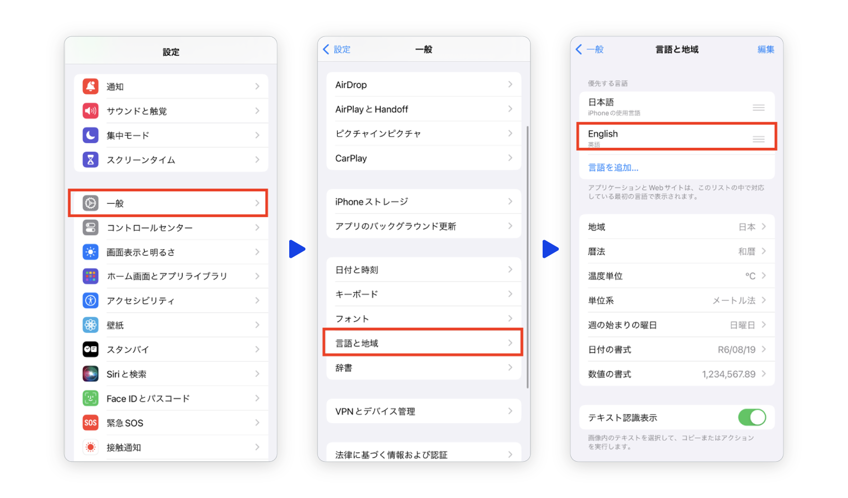 - iPhpne及びiPadの設定アプリで「一般>言語と地域>優先する言語」にて「English」を設定するとTalknoteアプリが英語表記対応となります。